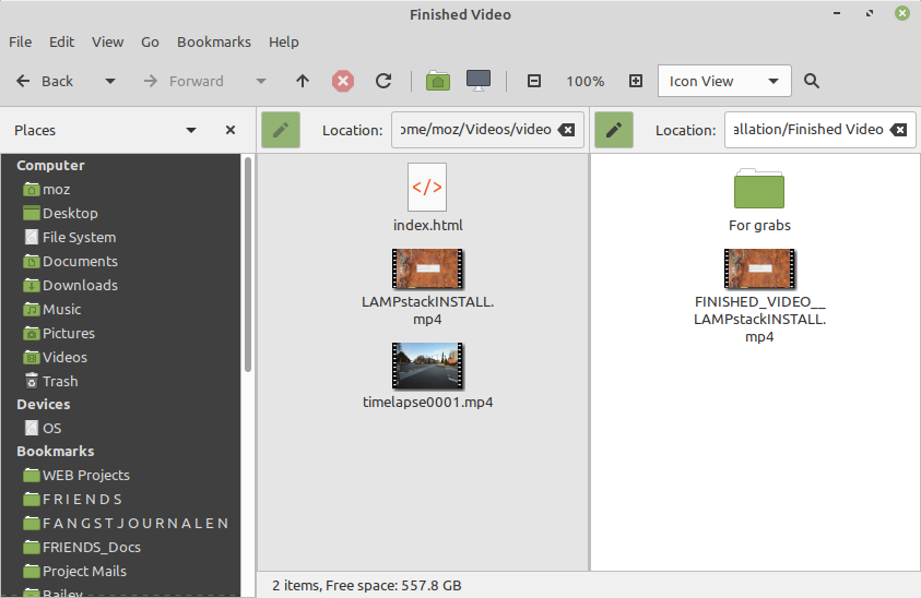 Caja, the filemanager.:Caja https://mate-desktop.org ![]() With Linux Mint Mate comes the default filemanager Caja. Caja is really superb. She gives you a good interface to your filesystem and the directories and files in general. You can connect directly to your server or other computers on the network, using several different methods. Like FTP, SSH and others. ![]() Another useful feature is bookmarking. You can bookmark directories, both local and on a network. You can of course open the files in you chosen programs, and you can do things like open the terminal in the active directory, and compress files or directories into several different package formats. I dont know how other filemanagers do, but in caja, if you delete a file, you can simply press CTRL-Z and the file will pop right back where it came from. Sweet. Also you can open a folder with administrator rights, or permissions. On the screenshots you see Caja with a dual pane, but you can actually make more, simply keep adding tabs by clicking CTRL-T. If having one tab only and you want to have a dual pane then you can just click F3 and it will open a new tab. And by clicking F3 again, it will close the one again. ![]() Also you can create empty files in Caja, and then right click it and open it with the preferred program for that filetype. This can be faster than opening you program and create the document and then save as, and find the place you want the document to live. You can choose to “Open With Other Application” that gives you a window where you can select the program you want to use. Above that function you will have the suggested program, that is the standard for a specific filetype. Can be Celluloid for an MP3 file, or a video file. Depending on what you have installed and which program is the chosen default program for that filetype. In the Preferences you can do all kinds of settings. Look through this to tweak your Caja to be as you want it to be. In the View menu you can choose what kind of view you want. Icons, List, or “Compact”. The latter being small icons in a listed presentation. ![]() Also you can select how you want the items arranged. By name, size or filetypes, etc. In the list view in the left side of Cajas window you have first The directories from you home folder, then devices that are currently mounted, and then follows the bookmarks that you have created. And I warmly suggest that you make bookmarks to the folders you may have, that you often use, and that may be hidden deep down in subfolders, or simply that you have difficulties remembering. Also if you work on a project currently, then make a bookmark so you have quick access to it. Remember that its is as easy to delete the bookmark as it is creating it. Last is the list of network folders. This was a little about Caja, the best filemanager in town. I really finds it a superb small useful and intuitive filemanager. Since its the kind of program that you use all the time, to navigate around you filestructure, it have to be able to do what you need is. And to me Caja is just that; all I need in a filemanager. ![]() Here are the menus in Caja: ![]() |